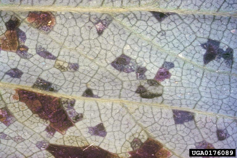 Lower surface of a strawberry leaflet affected by Xanthomonas fragariae. Angular, water-soaked and reddish-brown spots are evident