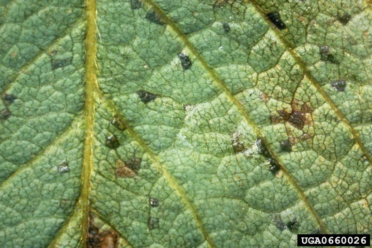 Close-up of Xanthomonas fragariae lesions on strawberry leaf