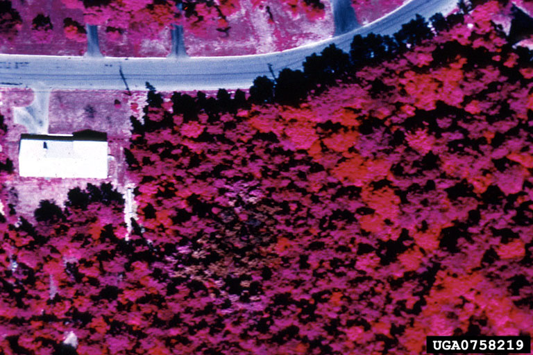 Vertical color infrared aerial photo showing a large southern pine beetle infestation
