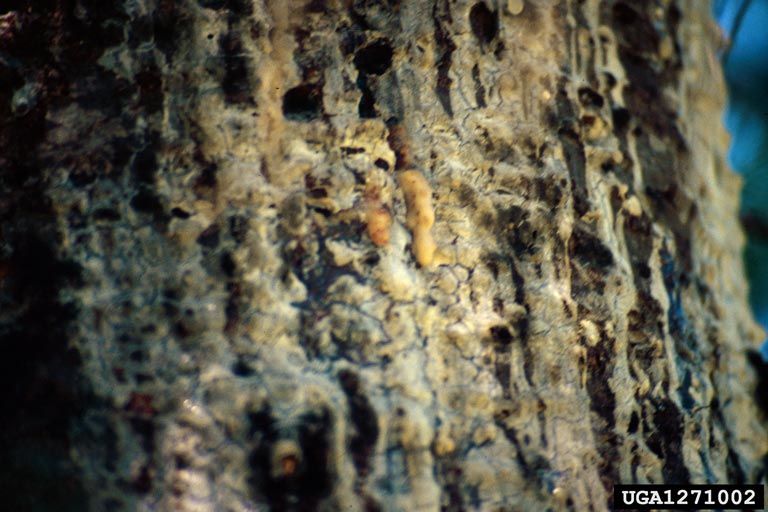 Sapsucker damage to bole/trunk in seed orchard. Associated with Dioryctria boring frass and pitch. Gifford Pinchot National Forest. Southern Washington Cascades.