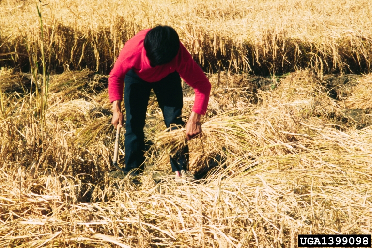 Hand harvesting grain in hybrid poplar forest, Outer Mongolia, China.