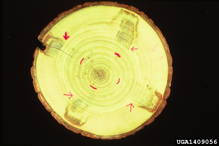 Again, the drill holes on this aspen penetrated to the red markes, yet discolored wood stopped at the arrows.