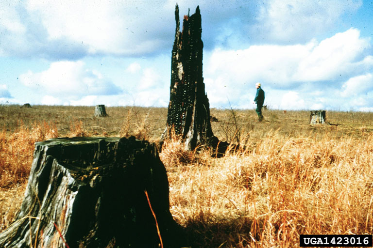 Open grass land and longleaf "stump orchard" remain after logging. High stumps from jump-butt cat faces after naval stores production.