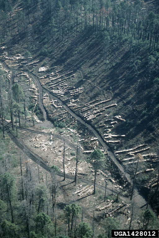 Aerial view of a timber salvage operation conducted near Mexico City following extensive tree mortality due to bark beetles and photo oxidant pollutants.