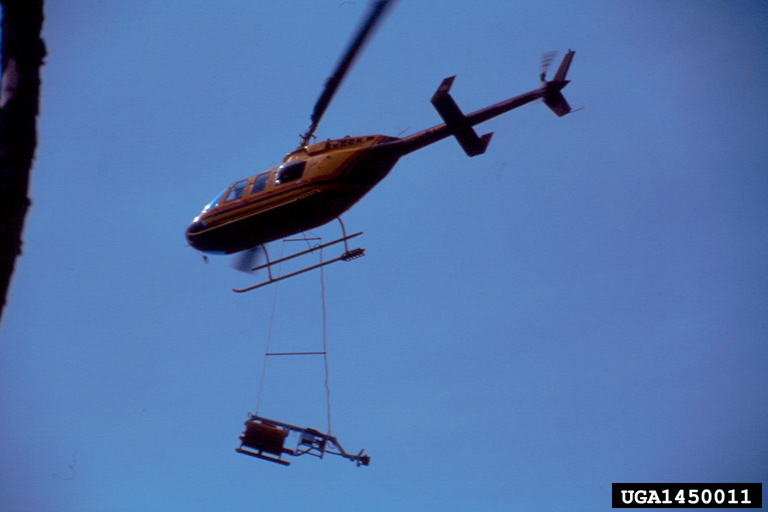 Helicopter with drip torch used for aerial ignition of prescribed fire. Ecosystem Management Emulating Natural Disturbance Project, Northwestern Alberta, Canada