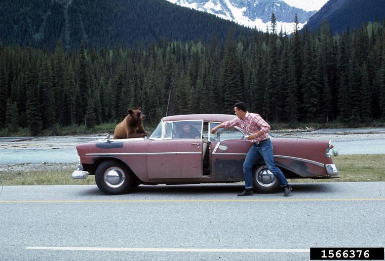 Bear begging for food by getting on hood of car - people threw food out the window to get the bear off the hood.