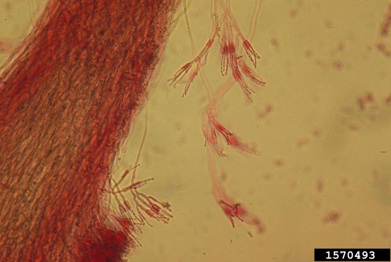 Penicillium ulaiense synnema showing a few conidiophores separated from the main column. Stained with lacto-fuchsin. June 1992
