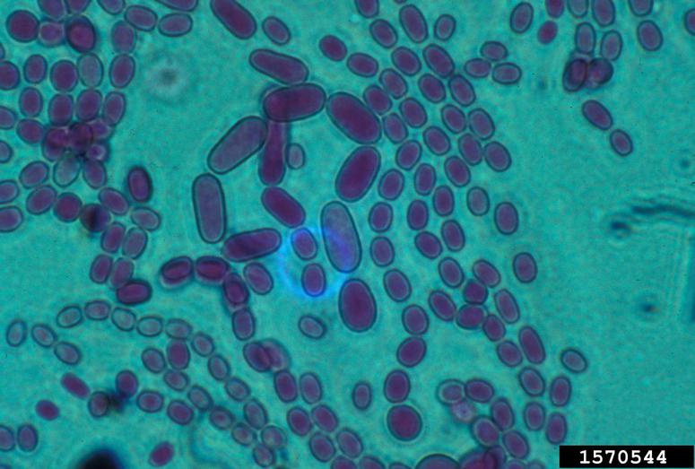 Conidia of Penicillum italicum (causal agent of citrus blue mold). Note the variability in size. February 1993