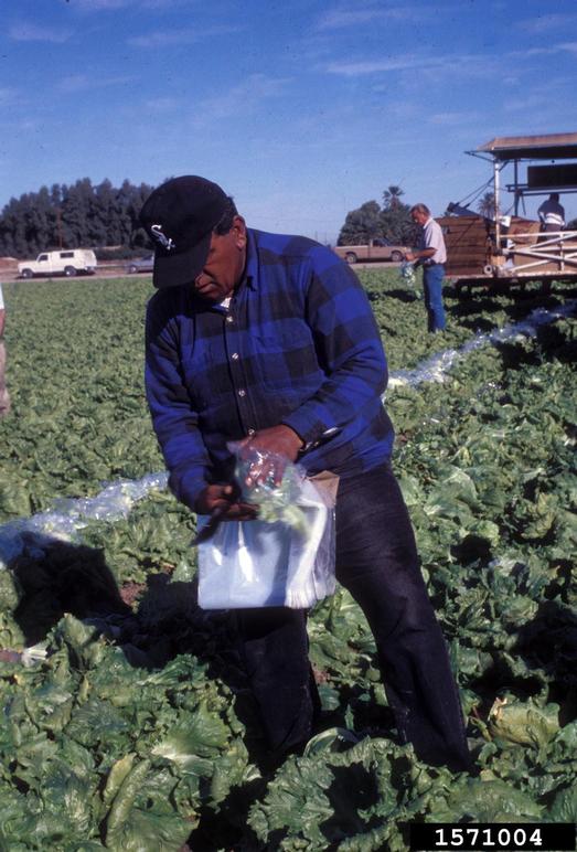 Iceberg lettuce harvest. Heads are cut, bagged and boxed in the field; February 1995