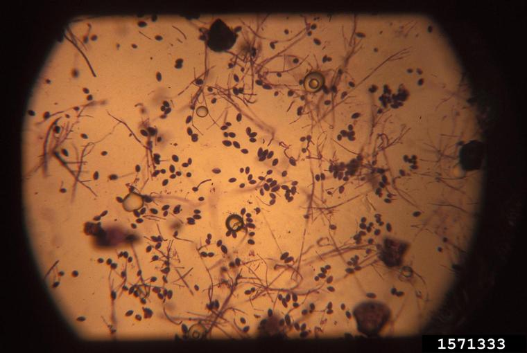 Light micrograph of Phytophthora infestans from potato leaf. Small, dark, football-shaped bodies are sporangia. June 1995