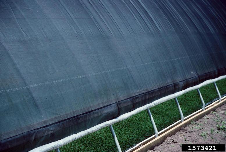 Float tray system for producing pepper transplants. Note the air space at the bottom of the greenhouse wall. Raising and lower this wall helps to control humidity and temperature. July 1997