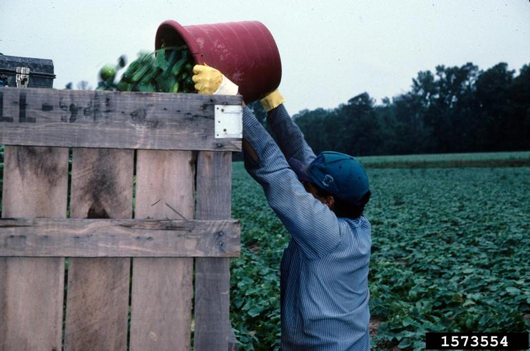 Pickling cucumber are still hand-harvested in some areas. July 1997