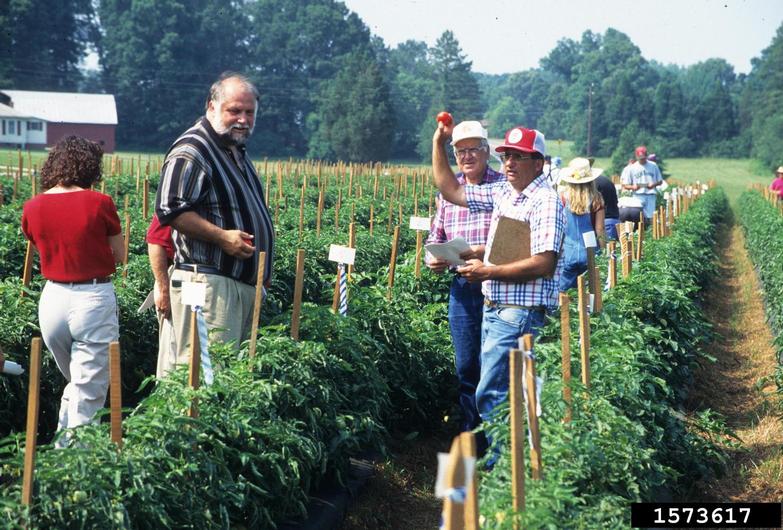 County Agent Darrell Blackwelder (left) and Dr. Randy Gardner (right; NCSU Plant Breeder) standing in field with group; holding up ripe fruit. July 1997