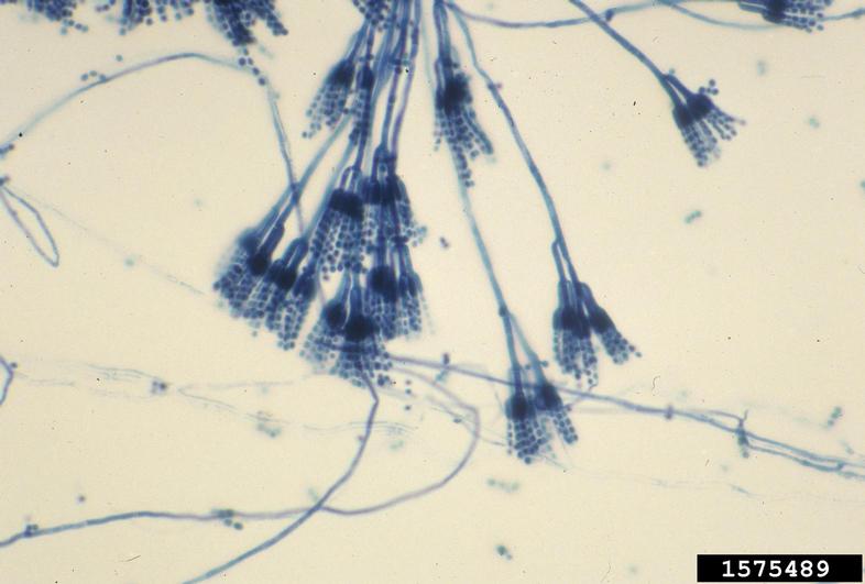 Micrograph (400X) of isolate 4 showing several penicilli teased from a coremium. August 1998