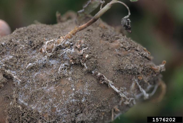 White mycelium on the root surface causing disease in an emerging sprout. May 1999