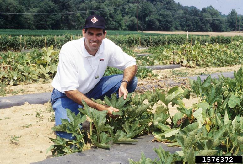 Dr. Gerald Holmes (Plant Pathologist NC State University) in research plots. August 1999