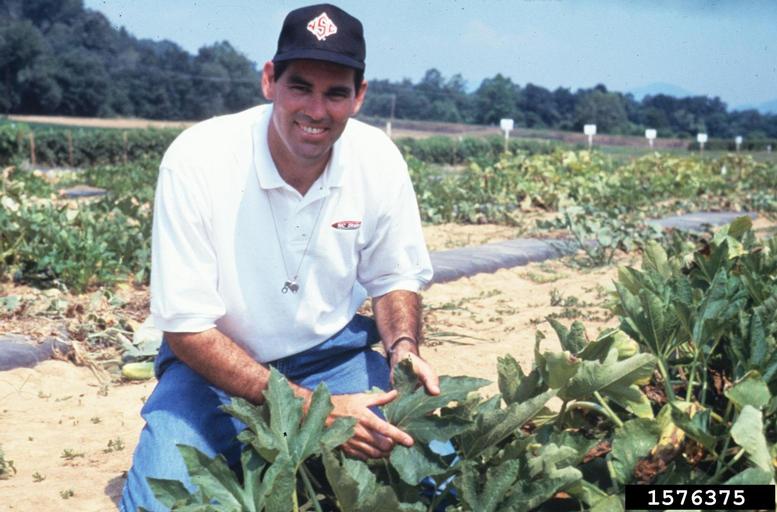 Dr. Gerald Holmes (Plant Pathologist NC State University) in research plots. August 1999