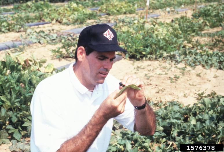 Dr. Gerald Holmes (Plant Pathologist NC State University) inspects squash leaf for diseases using a handlens. August 1999