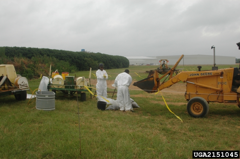 Decontamination of infected material. Washing and disinfecting pots before double bagging them and burying them in the bottom of a landfill.