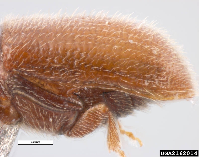 lateral view of thorax; short reddish brown pubescence and without scale-like vestiture on the elytral declivity; New Guinea, Bulolo, 2 Apr 1967, F.R. Wylie, ex Araucaria cunninghami