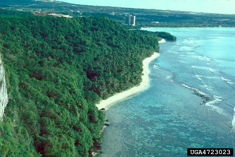 This point, about 175 ft. above the beach, overlooks limestone forest and near-shore reef. The main tourist/hotel district of Guam (Tumon) is nearly out of sight beyond the top of the cliff. Chamorro legend says that two lovers, forbidden to marry, braided their hair together and leaped to their deaths from the cliff, hence the name "Two Lovers' Point." 1995; 143 degr. E Long; 14 degr. N. Lat.