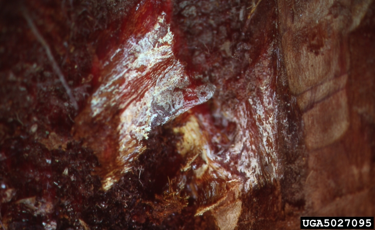 Armillaria spp. often produce white pads of mycelium under the bark of infected trees.