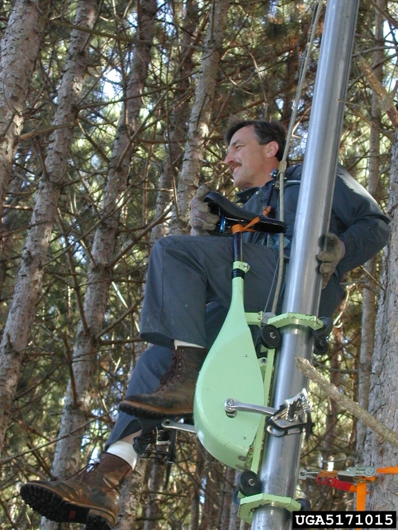 Mark Havel demonstrating use of a high-lift pruning apparatus at a woodland owner demo, Carlton MN, 2000.