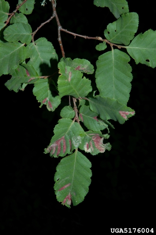 Red felt on foliage characteristic of damage by erinium mites (species unknown), January 2007