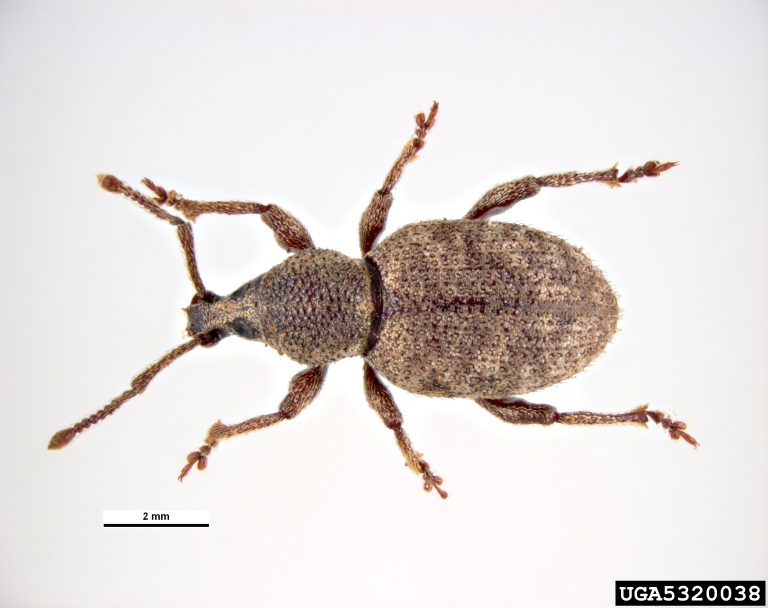 Adults are snout-nosed beetles, black to brown in colour, with a mottled pattern on the elytra and the spine on the fore femora is minute and simple; England: Ascot, Swinley Park, 1938.