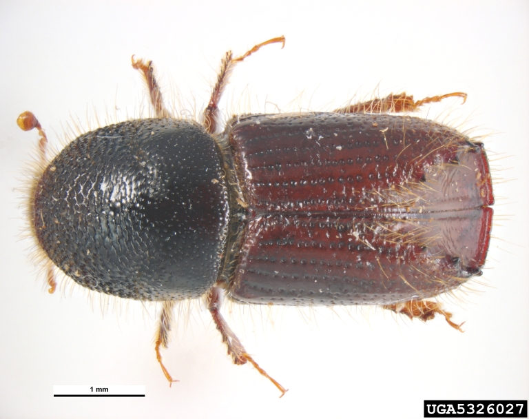 Dark brown, body length 4-5mm, four spines on each side of elytral declivity, third is largest and is capitate; the elytral declivity surface is dull and finely punctate. The pronotum is covered with asperites on the anterior half. Viewed from above, erect yellow hairs protrude from the body perimeter and margins of the declivity. Males have a larger knob in the middle of the "face" than do females, and males have fewer (less dense) hairs on the pronotum than females; Bohemia occ. Plzen, Aug 1978, M. Knizak 2480QA.