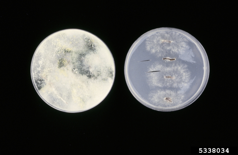 Nonselective medium vs. selective medium: Trichoderma growing from root pieces on nonselective medium (left) vs. Phytophthora nicotianae growing from root pieces on selective medium containing hymexazole and vancomycin (right)