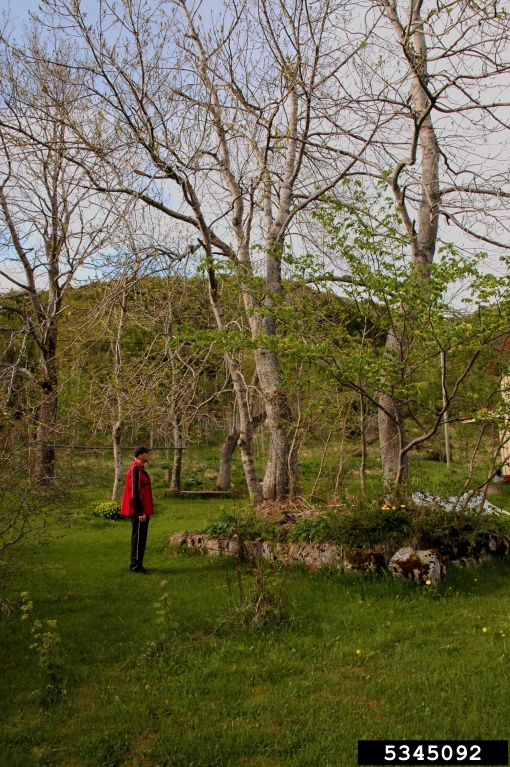 A wych elm bush Ulmus glabra in the foreground with leaves and seeds. In background over 100 years old ash trees (Fraxinus excelsior L., located at the bottom of sout-easterly mountain slope.