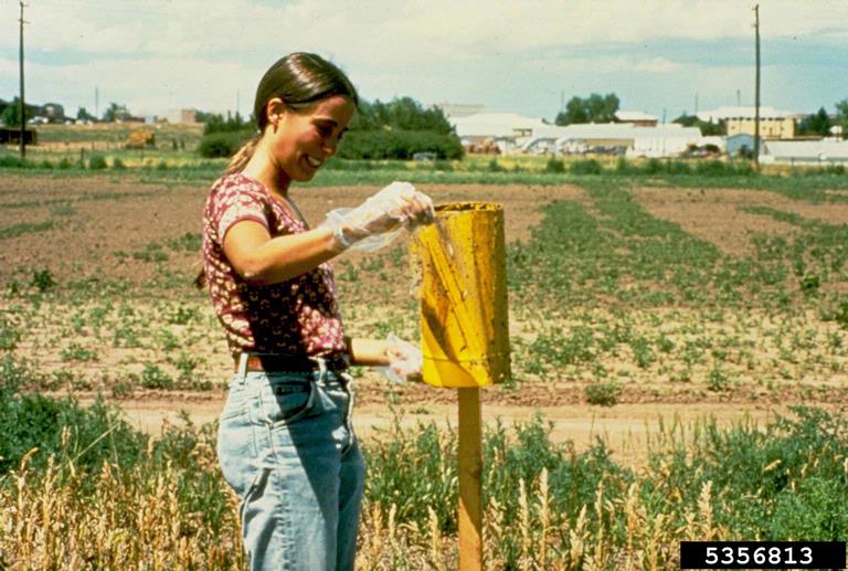 Cheerful young worker monitoring insects caught on a yellow sticky trap.