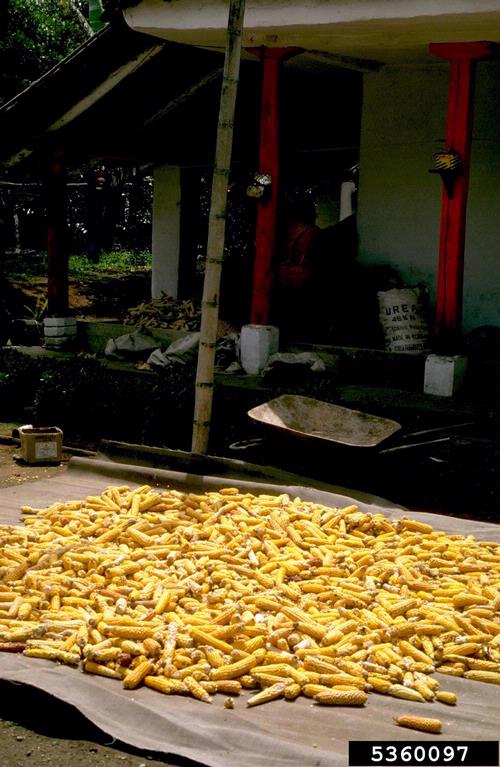 Ears of field corn spread to dry in the sun near Cajibio, Colombia.