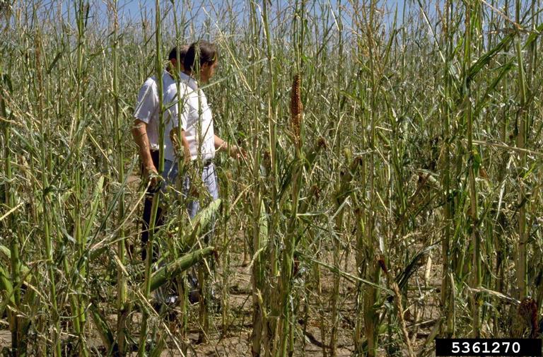 Damage to a field of corn due to a hailstorm that resulted in loss of 90% of the leaves.