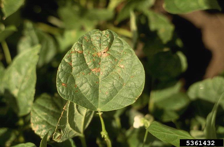 Symptoms of bacterial brown spot (Pseudomonas syringae pv. syringae) on bean leaves.