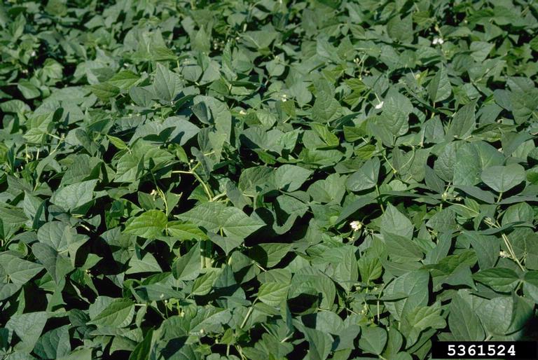 Field of dry bean plants showing development of the canopy - canopy has just closed over the furrow between rows.