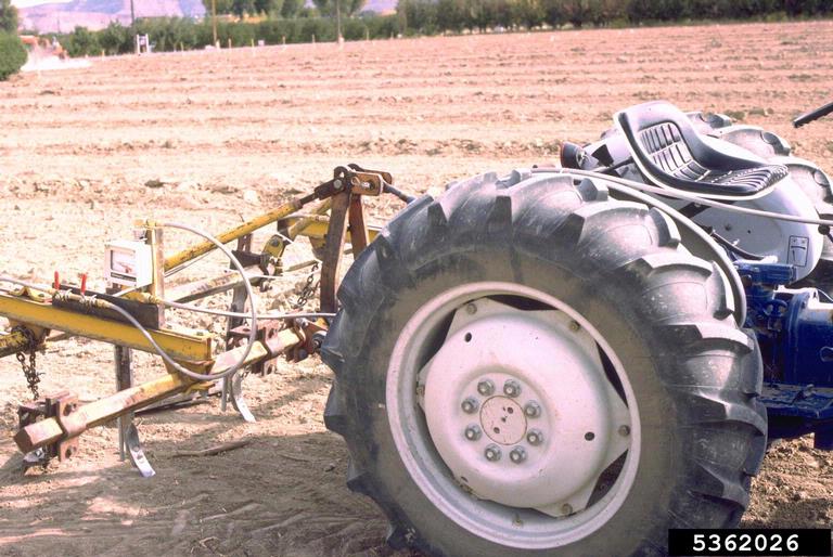 A Ford tractor used for shank soil fumigation on an orchard at Grand Junction in Colorado.