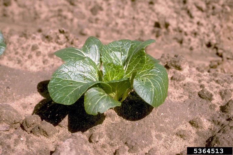 A seedling of chinese cabbage (also known as bok choi or bok choy) growing in the field. Please note that these are also sometimes referred to as Brassica rapa chinensis or B. rapa pekinensis.