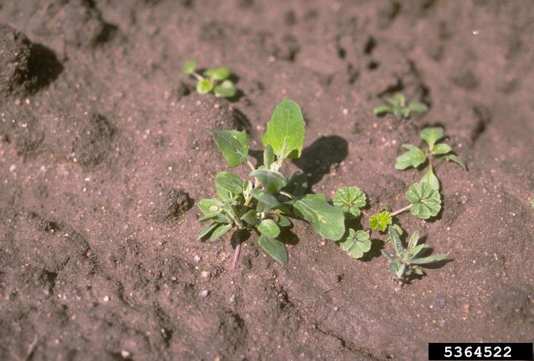 Seedlings of lambsquarters (Chenopodium album), with a seedling of common mallow (Malva neglecta) on the immediate right.
