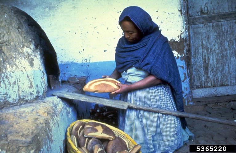 Baking bread in a primitive oven.