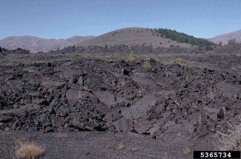 Scenic vista of mountains over a lava field in Craters of the Moon National Monument, Idaho.