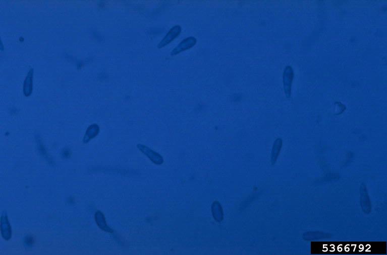Microscopic view of the conidia of Marssonina blight (Marssonina populi).
