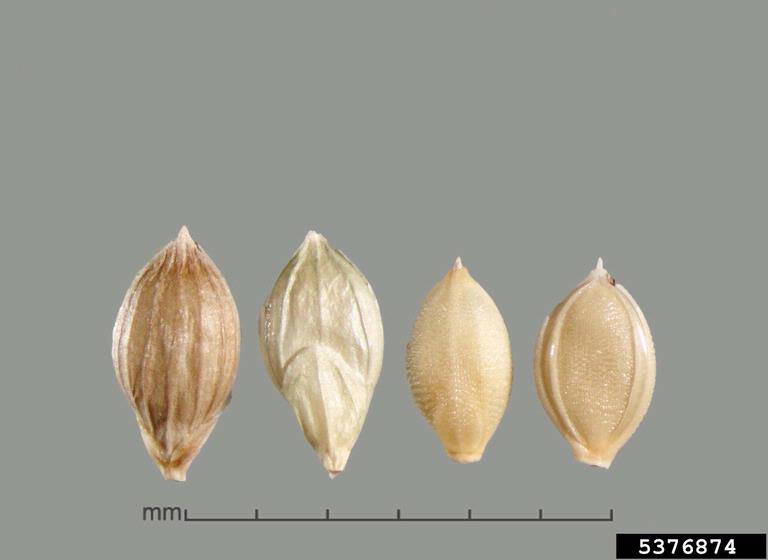 From left to right: spikelet in dorsal view showing upper glume; spikelet in ventral view showing lower glume and sterile lemma; floret in dorsal view showing lemma; floret in ventral view showing palea and margins of fertile lemma. Similar to an FNW taxon.