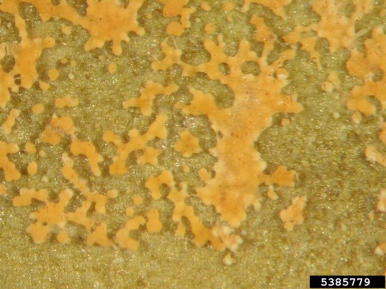 Small, salmon-colored, waxy spore-producing bodies ("sporodochia") on lower leaf surface. Tiny reddish dashes are sterile structures of the fungus called "setae".