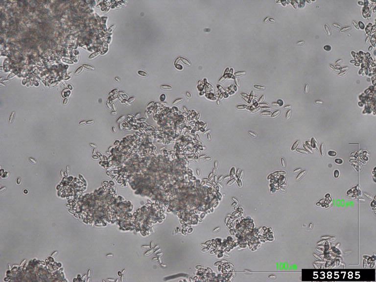 Many spores of the anamorph fungus Volutella buxi, the asexual stage of the fungus Pseudonectria rousseliana.