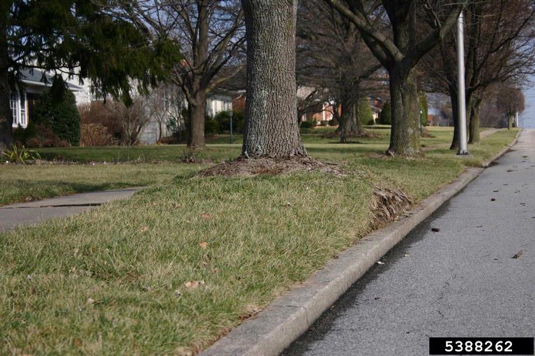 Soil freezing and thawing can cause the root plate to lift up toward the soil surface.