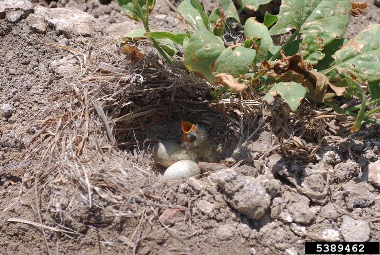 A killdeer nest with eggs and a chick under a field bindweed.
