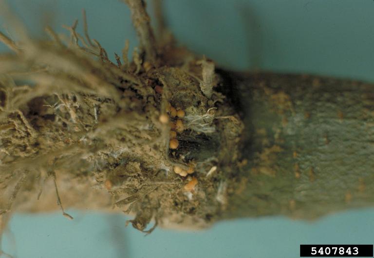 Close-up of mycelia and sclerotia of Sclerotium rolfsii on lower stem and roots of apple tree