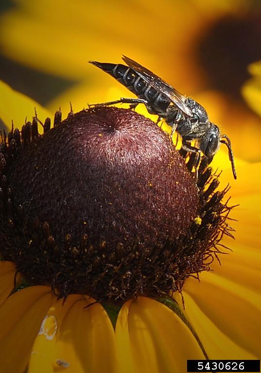 These insects are cleptoparasitic in the nests of Megachile. The lack of "teeth" at the end of the abdomen indicates this is a female.